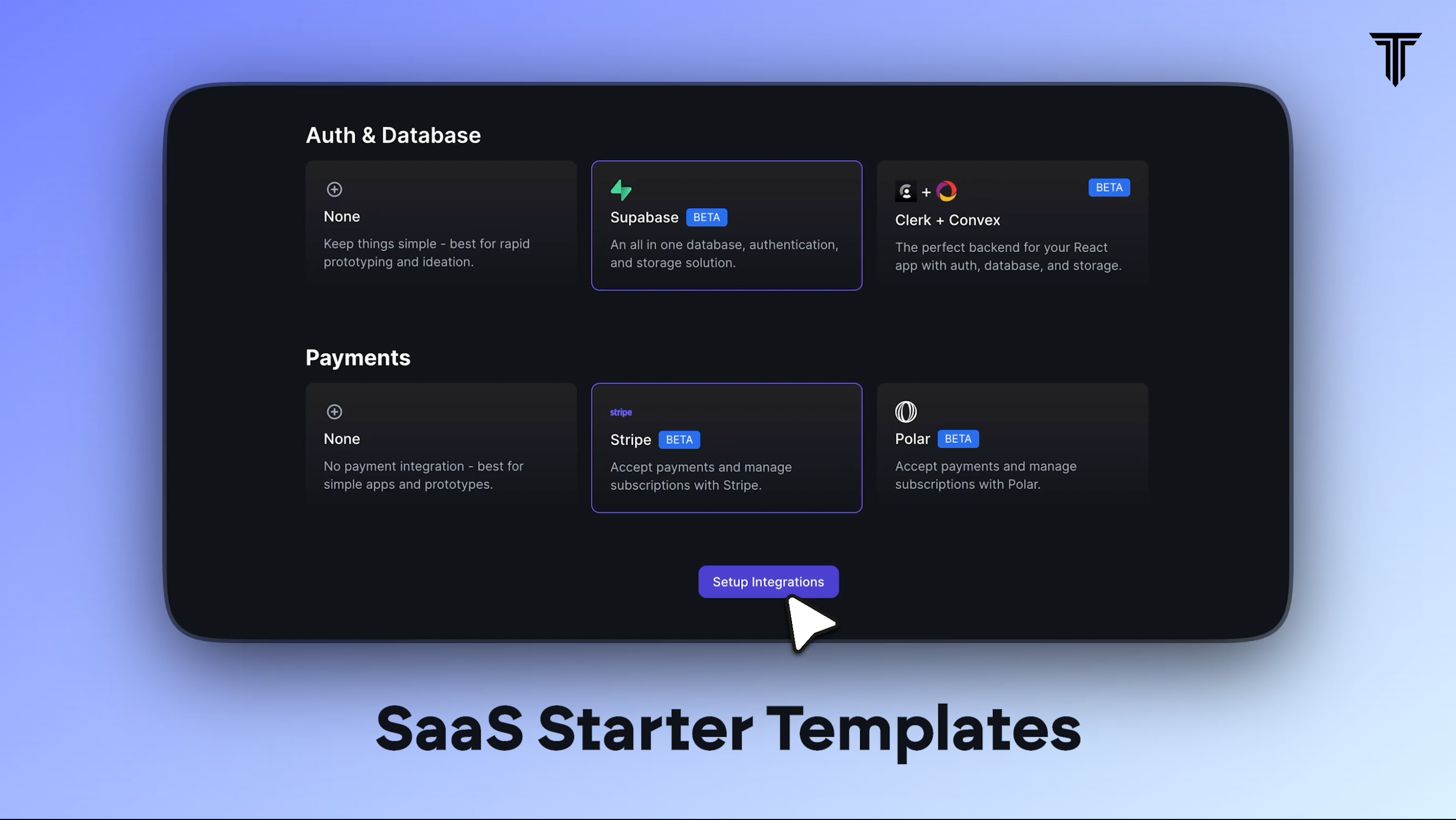 - Launch in Hours With everything integrated—from backend to auth to payments—you’re now ready to go live. Collect MRR, gather feedback, and iterate quickly.